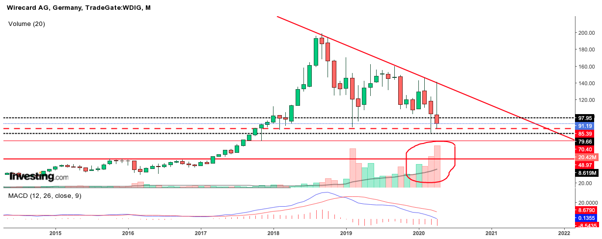 Was aus meiner Sicht gegen einen freien Fall zum jetzigen Zeitpunkt spricht, ist die Bedeutung dieser Unterstützungen sowie das hohe Volumen an Aktienverkäufen in den letzten Wochen und v.a. Tagen. Zu berücksichtigen ist mein Blickwinkel auf die Aktie. Ich bin derzeit nicht in Wirecard investiert, habe diese aber auf der Watchlist, sowohl auf der long- als als short-Seite.