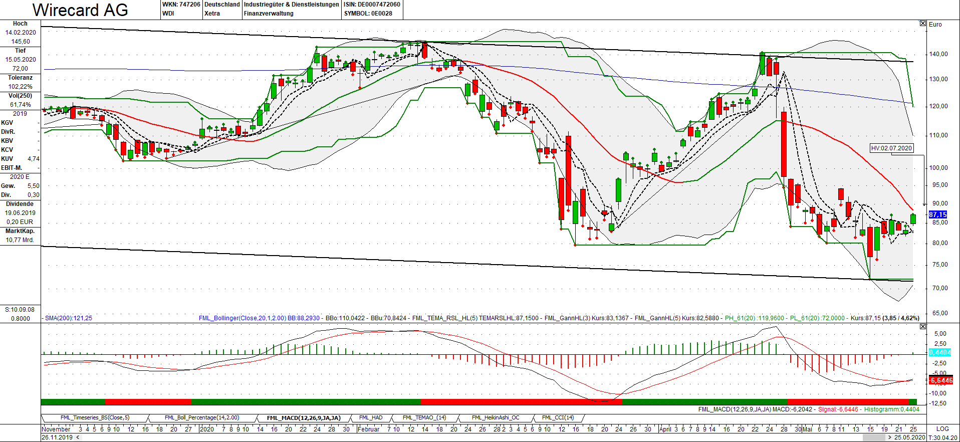 Gleich 2 starke Unterstützungen geben dem Kurs bei etwa €75 eine gute Stabilität. Erst darunter (auf Tagesschlussbasis) wird es brenzlig. Über der dem MA (blaue Linie, aktuell bei etwa €85) könnte es kräftig hoch gehen. Nach charttechnischen Gesichtspunkten ist ein Anstieg wahrscheinlicher als ein signifikanter Fall unter die €75