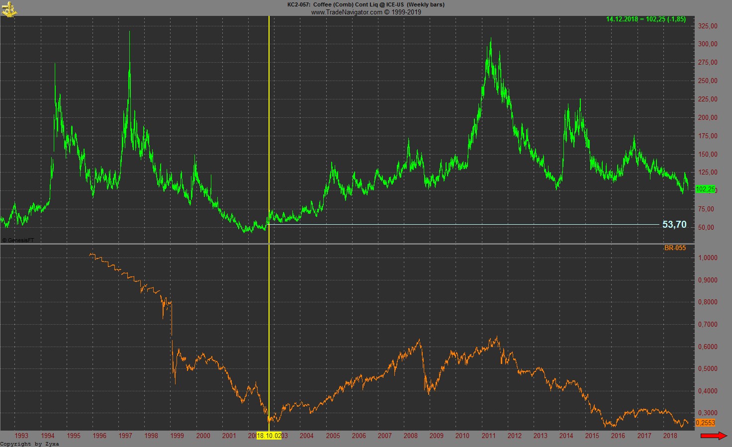 2002 stand der Real zum US Dollar auf selben Niveau wie jetzt....der Arabica Preis war aber doppelt so hoch.....(unten ist der brasillo Real)