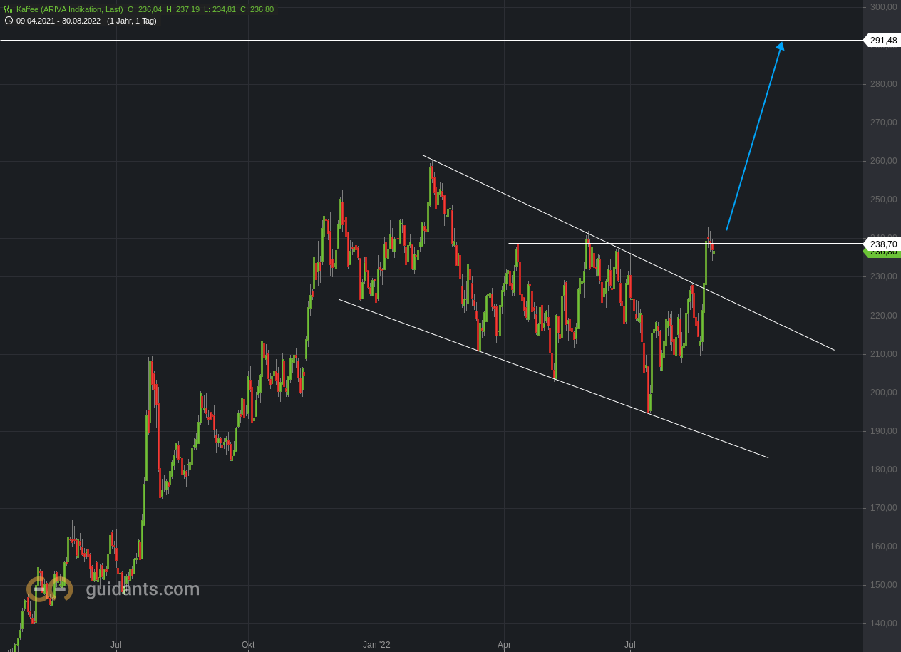 Timing nahezu perfekt. Der Markt konzentriert sich nun auf wichtigere Rohstoffe, die nach oben streben. Die schmackhafte Bohne ist nun ausgereizt und tritt nun die Reise nach Süden an!