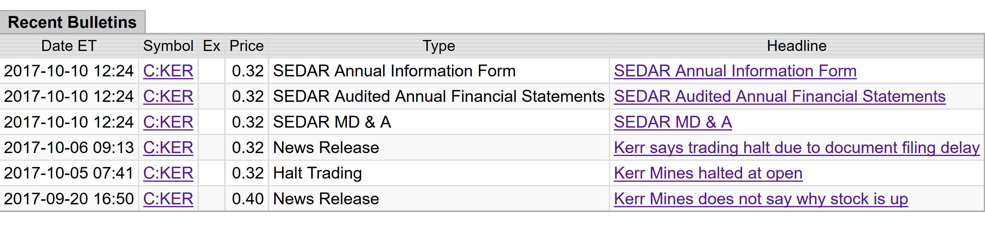Kerr Mines Inc. hat gesagt, dass das Wertpapierhandel halt am 5. Oktober 2017, durch eine Verzögerung bei der Einreichung der auf das Jahr bis zum 30. Juni bezogenen Dokumente aufgefordert wurde, 2017. Das Unternehmen arbeitet, das Problem in den effizientesten zu lösen und zeitnah.