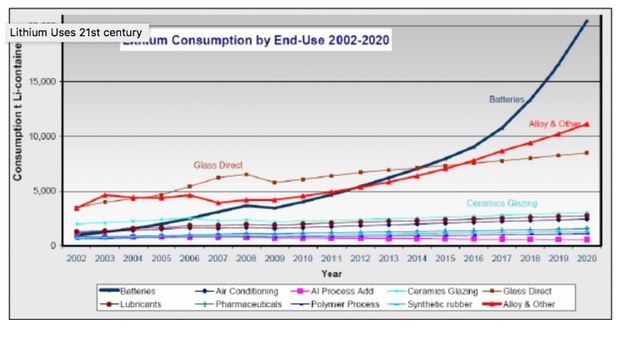 ....die Nachfrage nach Lithium-Mineralien und Chemikalien ist kontinuierlich um 10 bis 15 % pro Jahr gestiegen. Getragen wird das Wachstum von den Segmenten Lithium-Batterien, Glas und Keramik. Batterien für Laptops, Mobiltelefone, Pads und E-Book-Reader sind die beliebtesten. Die Nachfrage nach Lithium im Segment der Elektrofahrzeuge ist ab 2014 exponentiell gestiegen, da die weltweiten Automobilhersteller neue Modelle zur Sicherung von Marktanteilen bei Elektrofahrzeugen auf den Markt gebracht haben. Und der Trend scheint sich in den folgenden Jahren fortzusetzen, wie die untenstehende Grafik zeigt.