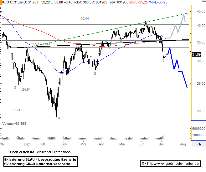 Rückblick: Lange Zeit konnte die Unterstützungszone bei 33,53 - 35,41 Euro genügend Kaufinteresse wecken, so dass die Kurse der KLÖCKNER - Aktie nach oben an dieser abprallten. Am 02. Juli stecken diese jedoch auf und die Kurse fielen dynamisch unter das Unterstützungsniveau zurück. Damit hat sich der Chartverlauf wieder deutlich eingetrübt, denn nicht nur, dass die Aktie nun wieder unterhalb ihrer gleitenden Durchschnitte notiert, mit dem deutlichen Rückfall muss auch die große inverse Schulter-Kopf-Schulter Bodenformation in Frage gestellt werden.