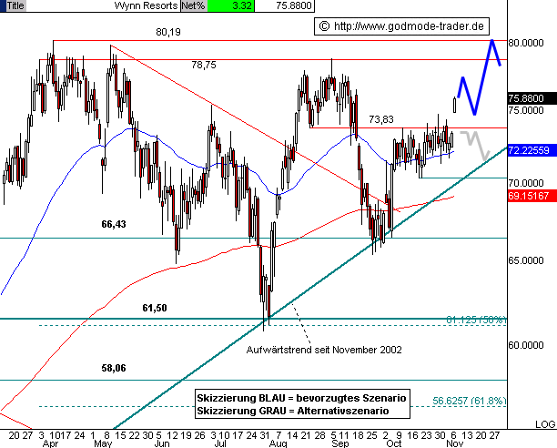 Kurz-Kommentierung: DieWYNN Aktie befindet sich seit November 2002 in einer intakten Aufwärtsbewegung. Im Oktober 2006 berührte die Aktie die Aufwärtstrendlinie und prallte daran nach oben ab. Im 73,83er Bereich setzten Konsolidierungen ein. Mit dem heutigen Kursausbruch gelingt es der Aktie über den charttechnischen Widerstand bei 73,83 $ anzusteigen. Die Aktie dürfte sich damit weiteres Aufwärtspotenzial bis 78,75 und 80,19 $ verschaffen. Kursstände unter 73,83 $ auf Tagesschlusskursbasis dürfte dieses generierte Potenzial negieren.