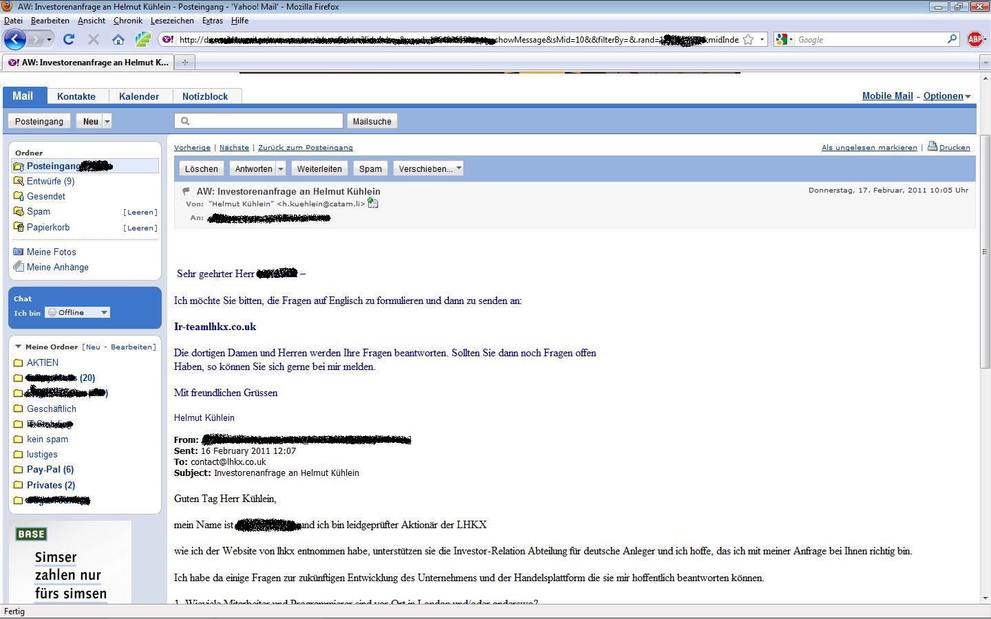 Wobei er mit der Aussage zu Kühlein schon Recht hat. Der kann sich nicht um jede Anfrage kümmern, dafür gibt es in en meisten Firmen spezielle Abteilungen/Ansprechpartner. Schade ist natürlich schon, dass man die Fragen auf Englisch stellen soll, obwohl man primär sowohl Anleger als auch (später) Kunden aus dem deutschsprachigen Raum als Zielgruppe hat.