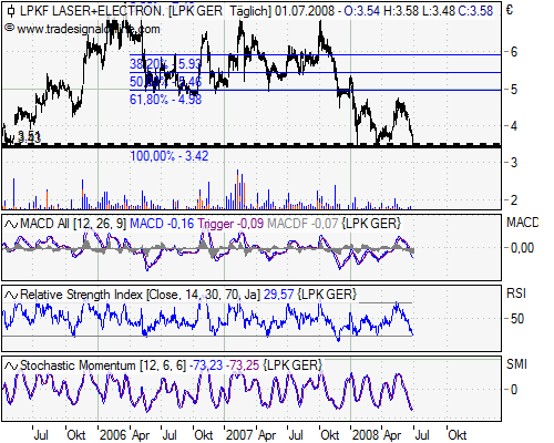 Die LPKF-Aktie schloss im Xetra-Handel bei 3,55 Euro (+0,85 Prozent). (14.08.2008/ac/n/nw)