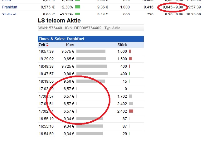 Nach einem einmaligen Versehen als Eingabefehler des Verkäufers sieht das jedenfalls nicht mehr aus. Entweder jemand verwechselt da ständig die 9 mit der 6 vorm Komma oder das ist ein Anzeigefehler. Allerdings zeigt mein Broker diese 6,x € Kurse in Frankfurt als tatsächlich gehandelt an.