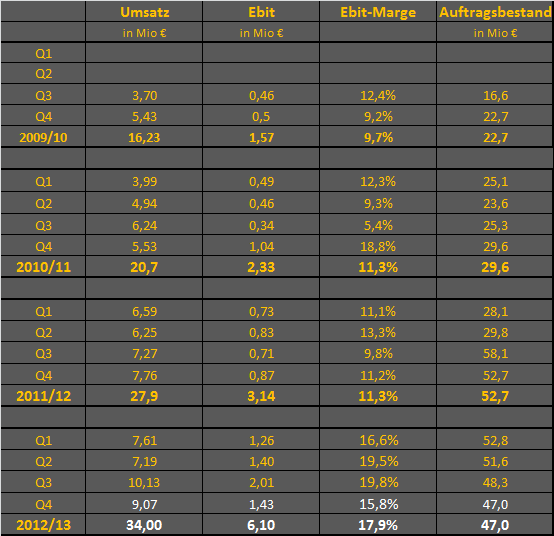 Was den Auftragseingang angeht, muss man das ebenfalls in Relation zu dem verdoppelten Auftragsbestand (von 29 Mio auf 58 Mio innerhalb eines Quartals) im letzten Jahr setzen. Ist doch logisch, dass der AB derzeit scheibschenweise fällt, weil dieser Großauftrag jetzt abgearbeitet wird. Der Auftragseingang ist aber durchaus okay derzeit. Aber sicherlich sollte in den kommenden 2-3 Quartalen mal wieder ein Großauftrag kommen, der das neuerliche Wachstum ermöglicht.