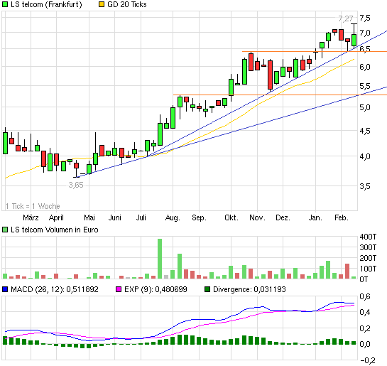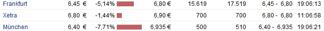 Allerdings würd ich schon sagen, dass es im Bereich 6,30-6,45 € eine gute Unterstützungszone gibt. Da verläuft ein Aufwärtstrend und die ehemaligen Verlaufshochs. 38TageLinie auch bei 6,45 €.