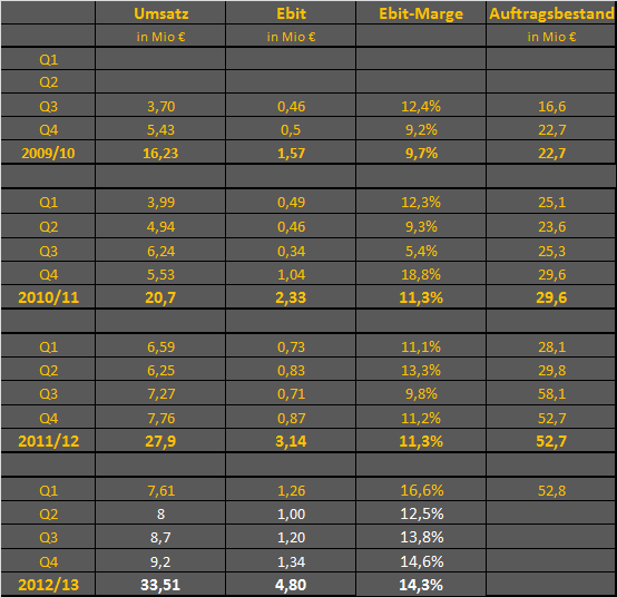 Wenn man jetzt schon bei gesicherten 30,3 Mio € Umsatz liegt, ist es schwer vorstellbar, dass die Neuaufträge der verbleibenden 9 Monate nur zu 3,2 Mio € Umsatz im Geschäftsjahr 2012/13 führen.