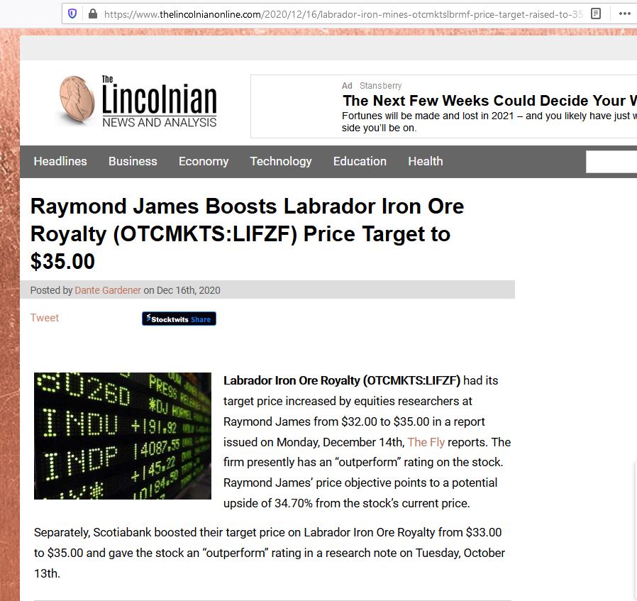 " ... On December 20, 2016 , the Acquiror acquired 32,456,648 common shares of the Corporation (the "Common Shares") pursuant to the plan of compromise and arrangement dated December 6, 2016 in respect of the Corporation and its two subsidiaries, Labrador Iron Mines Limited and Schefferville Mines Inc