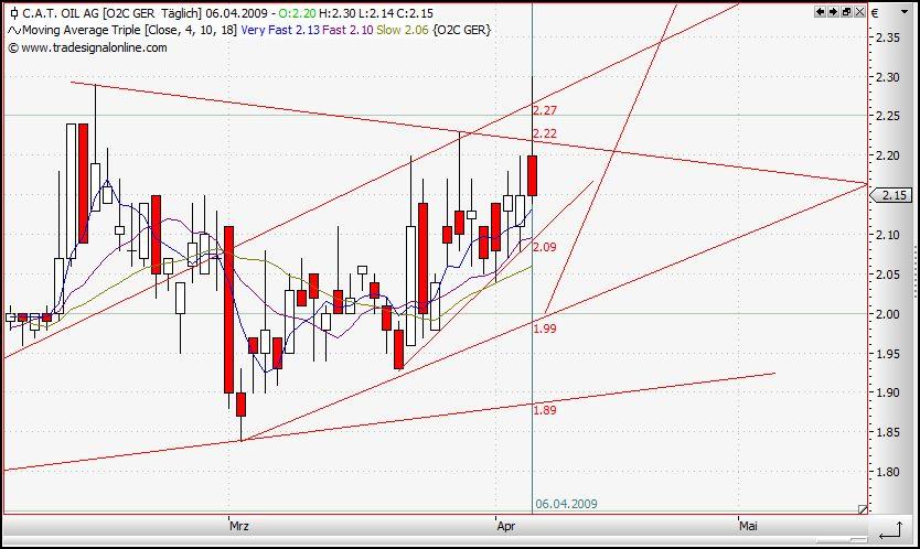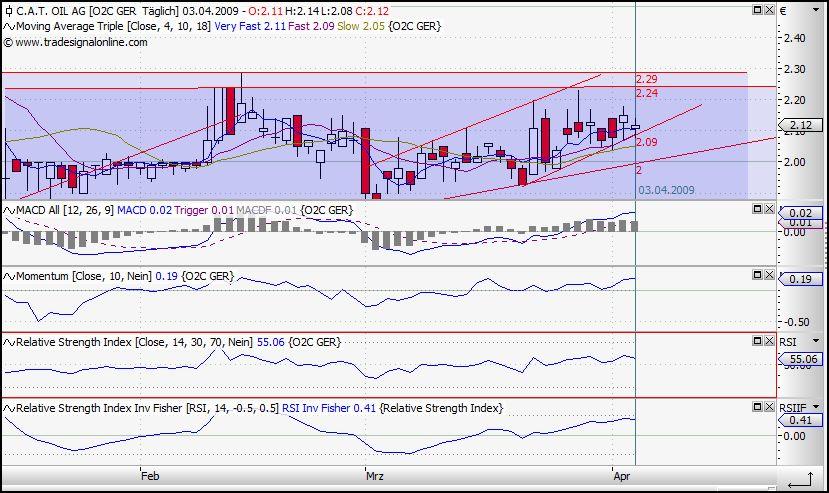 Übersetzt heisst dies, wenn es heute nicht noch nach oben knallt, dürfte Cat OIL bis 7/8.4.09 auf 2,24 steigen, dann entscheide­t sich, ob ein größerer Durchbruch­ zunächst bis  2,59 EUR möglich wäre. Der MACD zeigt, das der Wert derzeit steigend ist und der RSI zwischen 30 und 70 Punkten aufwärts gerichtet zeigt, dass die Käuerschic­ht langsam steigt.