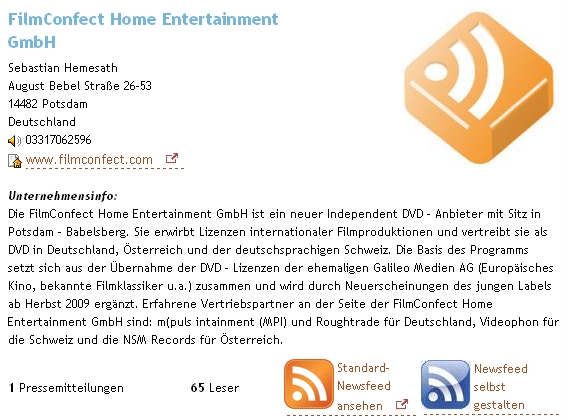 klick auf "Your Family Entertainment AG (München) http://www.yf-e.com " dann partner und an stelle von fc steht da z.b. starmedia home entertainment!? leider ist es mittlerweile wirklich ein witz, wie viele nachhaltige dinge man über filmconfect findet.