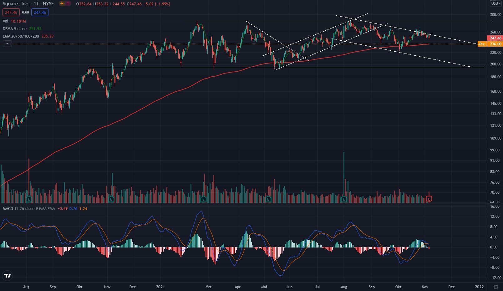 Nach unten sollte die 200 $ marke halten. Nach oben erst beim Ausbruch über ca 290 $ hätten wir einen Kaufsignal aus der Seitwärtsrange. Ich vermute dass die Square in der Range noch eine Weile verbleiben wird. Das 4 Quartal sollte deutlich besser laufen, das könnte den Kurs stützen.