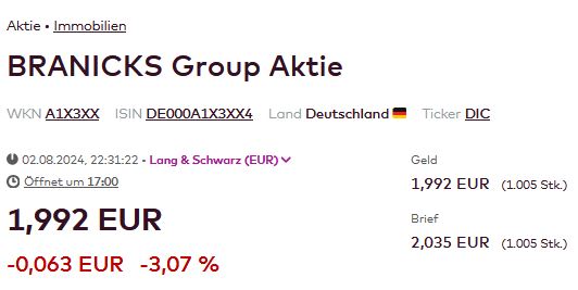 | A1X3XX | BRANICKS GROUP AG. | 2,02€ | 2,04€ | 1,15% | 16:04:08 |