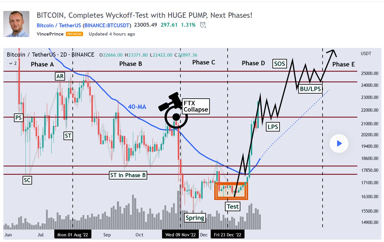 Bei tradingview gibt es einen Analysten, der die Bodenbildung analog Wyckoff mit dem Kursverlauf von Bitcoin vergleicht. Bisher ist der Kursverlauf erstaunlich ähnlich.