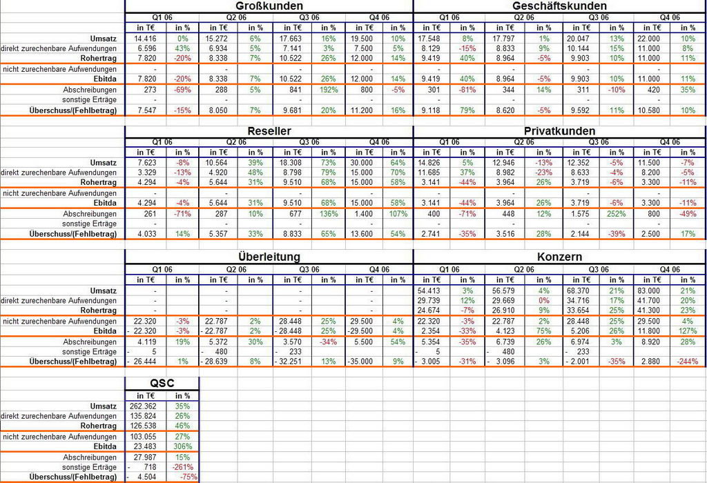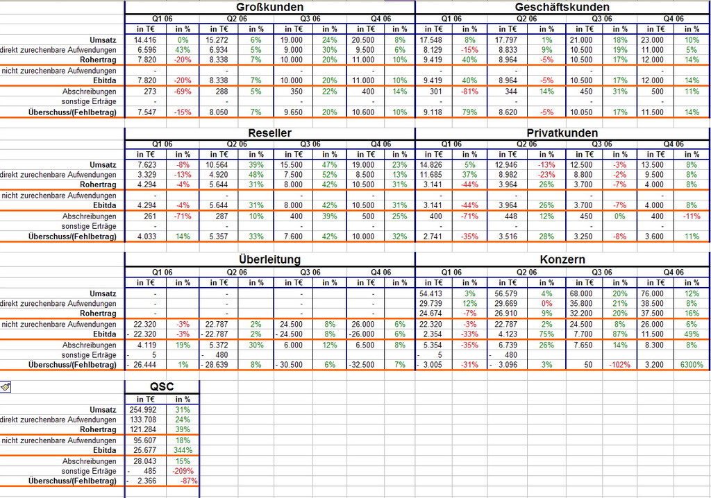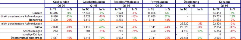 So heute hat QSC die endgültigen Daten vorgelegt. Meiner Meinung nach war das erste Quartal die reinste Enttäuschung. Wie man sehen kann hat sich gegenüber dem 4.Quartal 05 fast nix getan. (% Daten beziehen sich auf q4 zu q1 Wachstum) Im Bereich Großkunden hat der Umsatz stagniert und das Ebitda ist eingebrochen. Der von QSC als Zukunftsmarkt gepriesene Bereich Reseller hat sogar sinkende Umsätze zu verzeichenen und im Bereich Privatkunden halbiert sich das Ebitda fast. Positiv fällt nur der Bereich Geschäftskunden mit ordentlicher Ebitda Steigerung und etwas Umsatzzuwachs auf. Damit wird hier fast das gesamte Ebitda herausgerissen.