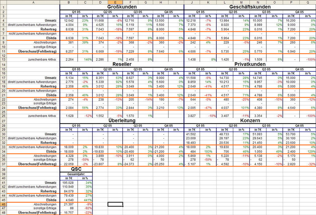 Ich finde Deine Tabelle gut,Du hast Dir auch viel Mühe damit gemacht, aber hast Du z.B. berücksichtigt, das QSC im 1. Quartal schon die Gebühren an die Telecom für das ganze Jahr entrichtet hat? Das verfälscht natürlich etwas die Daten für`s erste Quartal. Nichts für Ungut, wünsche noch einen schönen Tag.