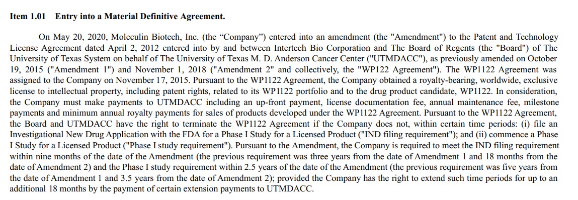 Hier nun das "neue" überarbeitete WP1122 Lizenzabkommen, https://ir.moleculin.com/all-sec-filings/content/...617-20-000138.pdf
