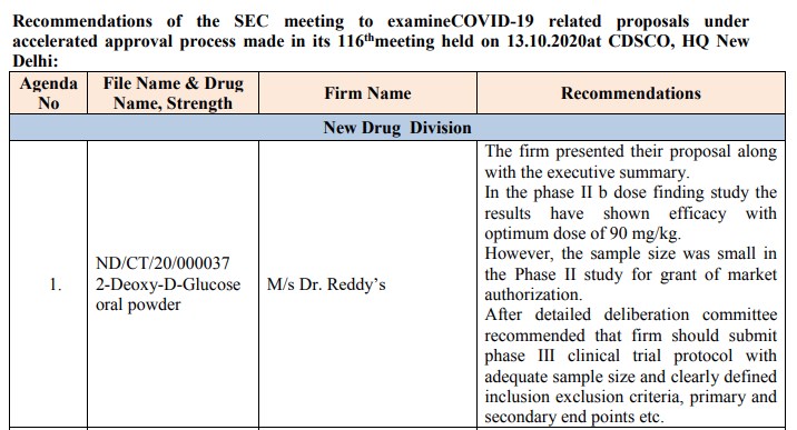Der in Hyderabad ansässige Arzneimittelhersteller Dr. Reddy's präsentierte die Ergebnisse der Phase-2-Studien des Medikaments vor dem Fachexpertenausschuss der Modi-Regierung (SEC), der den Apex-Regulator, den Drug Controller General of India, bei Anträgen auf Zulassung neuer Medikamente, Impfstoffe und klinischer Studien berät.