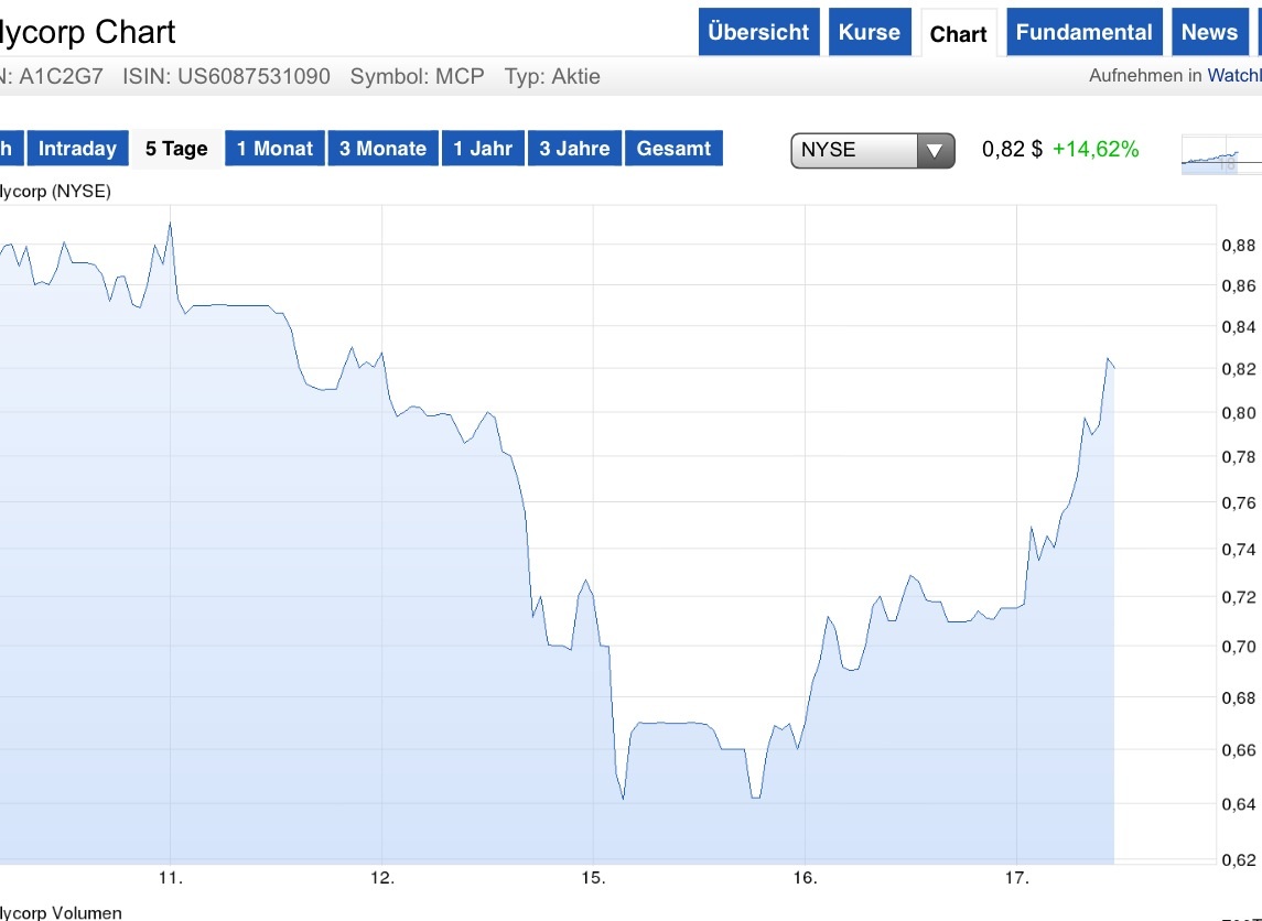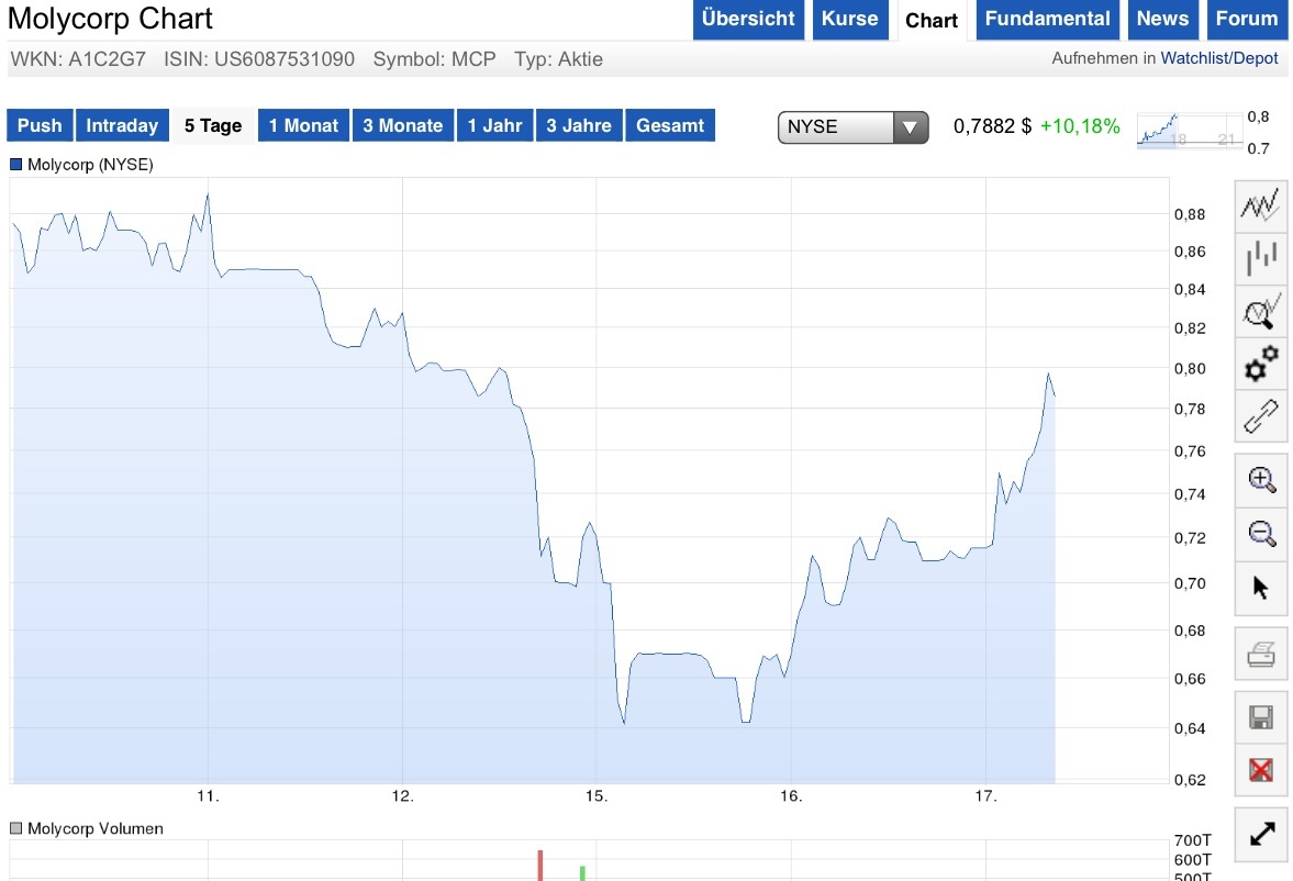 Anleger sollten vorsichtig sein Shares of Molycorp Inc (NYSE:MCP)­ are trading at $0.86. The price is 86.7% off the 52-week high and 8.1% off the 52-week low. But, investors should exercise caution as the short interest is growing high at 36.25% of the floated shares. A high short interest indicates that the market is expecting further price decline in the coming sessions. Investors in Molycorp Inc (NYSE:MCP)­ witnessed a surge in their wealth as the shares shot up 1.16% or 0.01 points to close at $0.87. The trading commenced at $0.91 and the price never settled into the negative territory,­ finally ending the session in the positive territory;­ this indicates strong inherent strength in the upmove. The previous close of the counter was $0.86. Interestin­gly, the 52-week high of the share price is $6.45. At close, the volume was measured at 3,390,005 shares. With 244,775,00­0 shares outstandin­g, the market cap of the company is $213 million. The shares have a 52-week low of $0.7926.