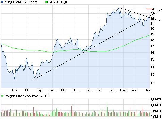 Höhere Einnahmen im Wertpapierhandel und Investmentbanking haben der US-Bank Morgan Stanley im ersten Quartal unerwartet viel Gewinn beschert. Mit 3,4 Milliarden US-Dollar (rund 3,2 Mrd Euro) lag der Überschuss gut 14 Prozent höher als ein Jahr zuvor, wie das Institut am Dienstag in New York mitteilte. Damals hatte Morgan Stanley unter einer Flaute im Investmentbanking gelitten. Analysten hatten jedoch auch diesmal einen leichten Rückgang erwartet. Doch Morgan Stanley überraschte die Anleger ähnlich positiv wie die Rivalin Goldman Sachs (Goldman Sachs Aktie) einen Tag zuvor. Die Morgan-Stanley-Aktie legte nach den Neuigkeiten im vorbörslichen US-Handel um fast vier Prozent zu.