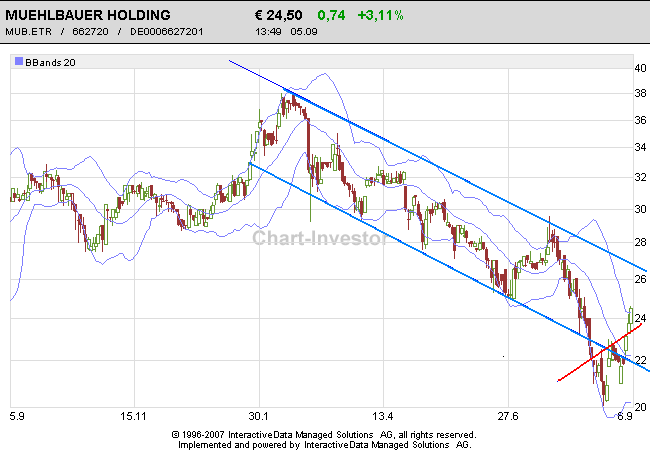 Das derzeitige Kursniveau ist vielleicht eine historisch günstige Chance. Klar klingt hochtrabend und wenn die Börse bald nachgeben sollte wird es auch Mühlbauer treffen. Aber der Titel ist in relativ festen Händen und der Vorstand wird auch nicht mehr lange zuschauen können ohne die enormen Finanziellen Mittel des Unternehmen einzusetzen um Aktien zurück zu kaufen.