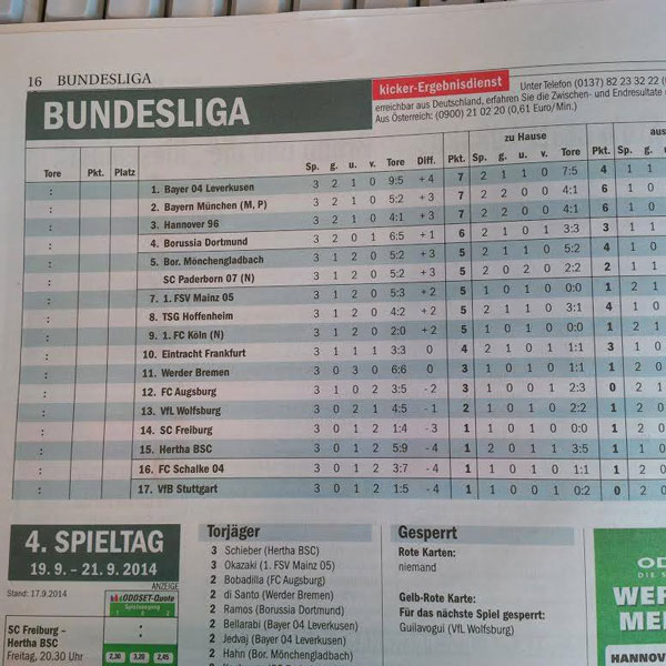 Rainer Holzschuh und seine gesamte Kicker-Redaktion sitzen da auf einer Meganachricht, dürfen die Katze aber noch nicht aus dem Sack lassen. Blöd nur, dass wir in der neuen Ausgabe schon die aktualisierte Bundesliga-Tabelle finden. Um nicht weiter Schaden zu nehmen, hat die Liga Platz 18 offenbar nonchalant gestrichen und sich so des Hamburger Sport-Vereins entledigt. Wir fordern eine Stellungnahme von DFL-Boss Christian Seifert.