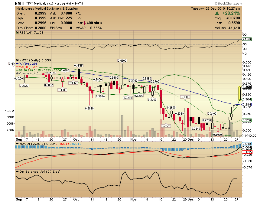 NMT Medical is currently above its 50-day moving average of $0.28 and should find resistance at its 200-day moving average of $1.43. Look for these moving averages to climb to confirm the company's upward momentum.