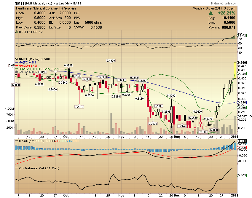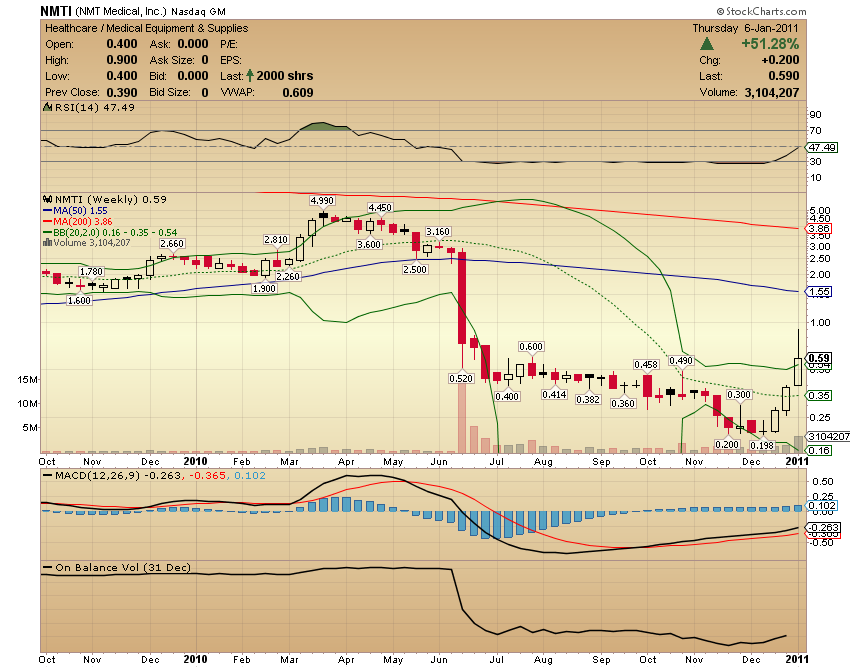 In the past 52 weeks, shares of NMT Medical have traded between a low of $0.20 and a high of $4.99 and are now at $0.42, which is 109% above that low price.