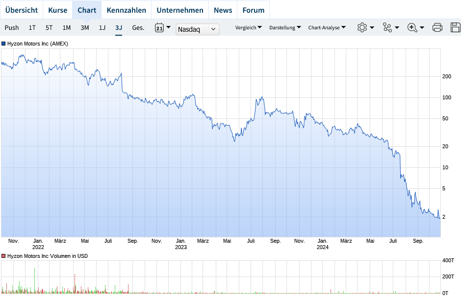 In diesem Sinne, und im Interesse der LeserInnen dieses Threads: Hier der Chartverlauf von Hyzon Motors der letzten 3 Jahre.