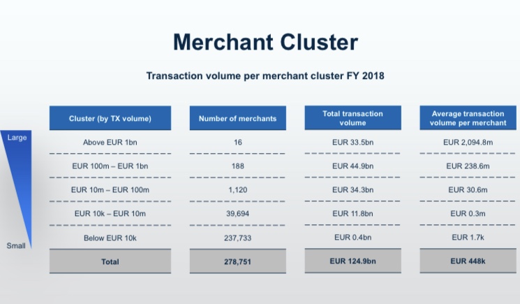 Die Händler mit einem Transaktio­nsvolumen >100mio machen über 50% des Gesamttran­saktionsvo­lumen von Wirecard aus. Ich Unterstell­e dass man einen Kunden mit Transaktio­nsvolumen >100mio nicht einfach erfinden kann.