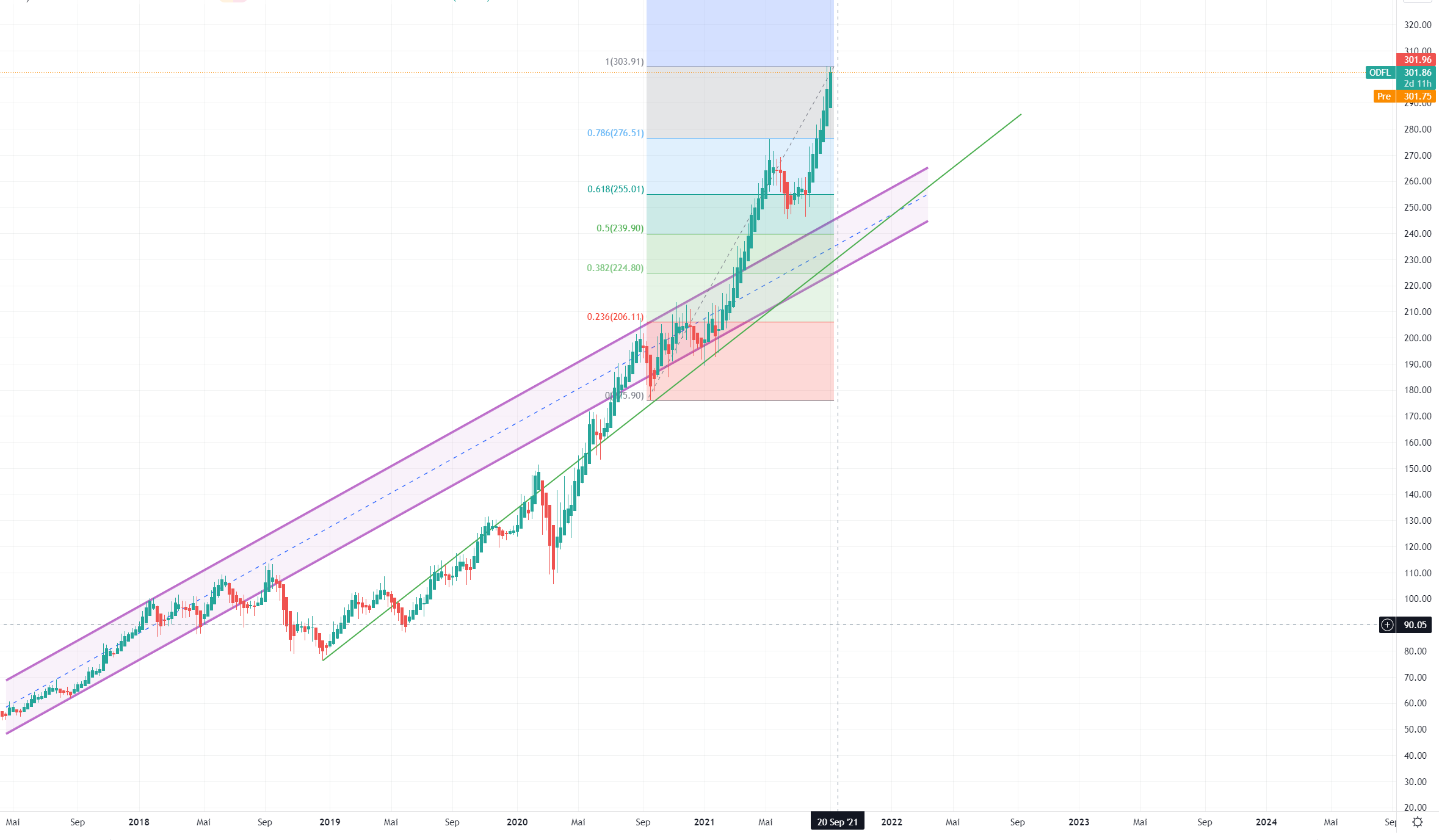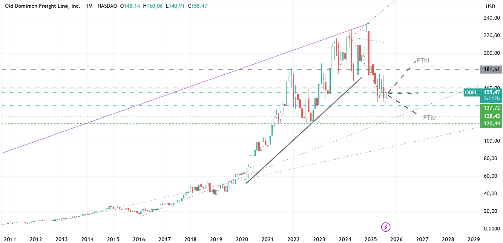 Maßgeblich im Umgang mit dem Titel sollte das Verhalten des Kurses in der Nähe der beiden aufsteigenden Trendlinien, die beiden grau gestrichelten, sein; diesee sind 18% bzw. 38% entfernt. Klar - sehen die Analysten den Wert auf dem aktuellen Niveau einigermaßen fair und stabil bewertet; aber die Erträge müssten doppelt so stark steigen wie es vom Markt erwartet wird, damit der Titel für Käufe wieder attraktiv wird und genau da gibt es aktuell noch zu viele black boxes. Ein Aufhellen durch das FED-Stühlerücken, das aller spätestens nächsten Frühling vollzogen sein wird, könnte hier schon wieder zu Überlagerung führen. Also Kursanstiegen, die sich finanzmathematisch eigentlich nicht herleiten lassen. Damit hat ODFL erst einmal seine langfristig so wunderbaren Rentnerpapiereigenschaften eingebüßt, ich hoffe nur vorübergehend.