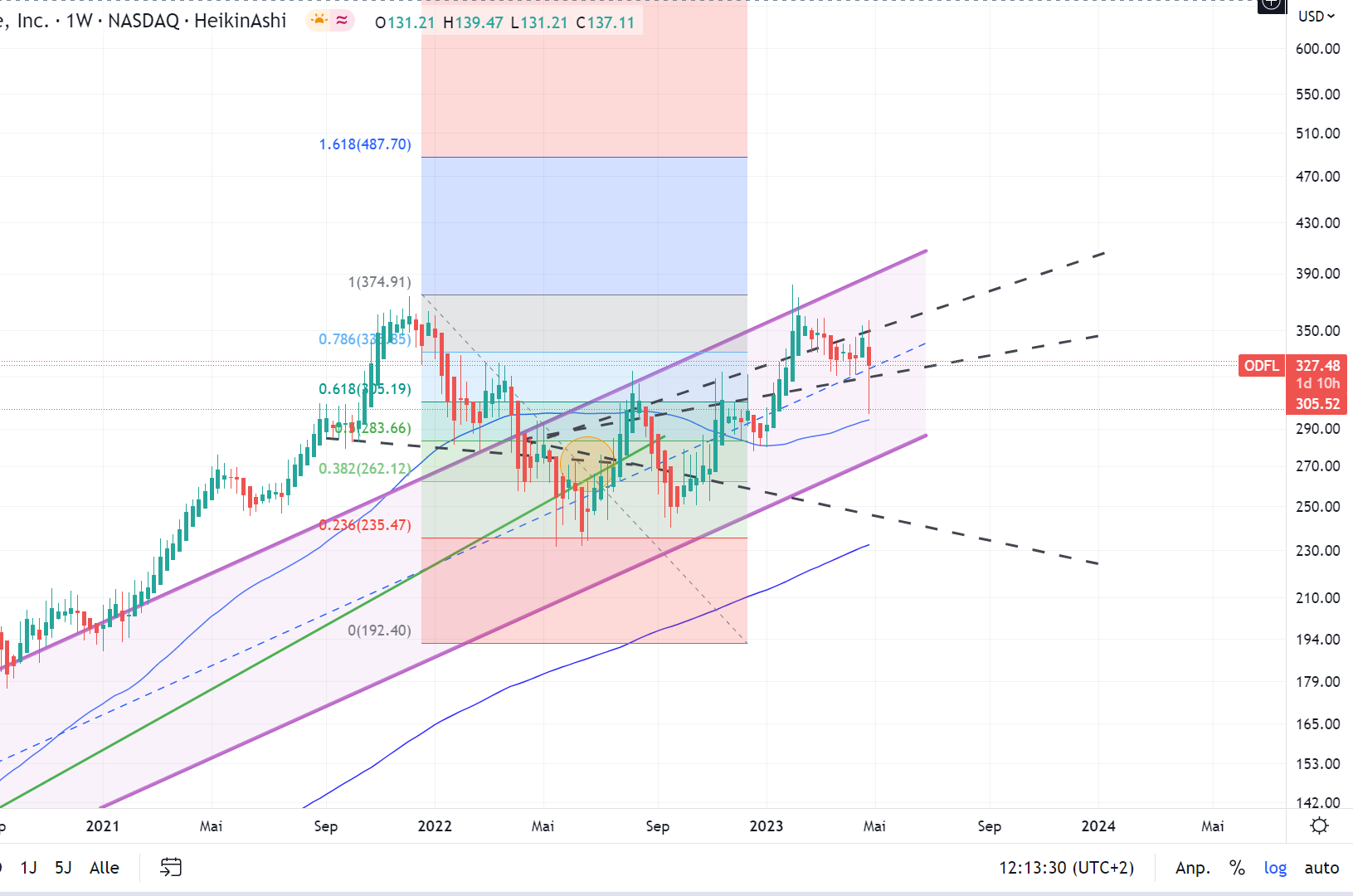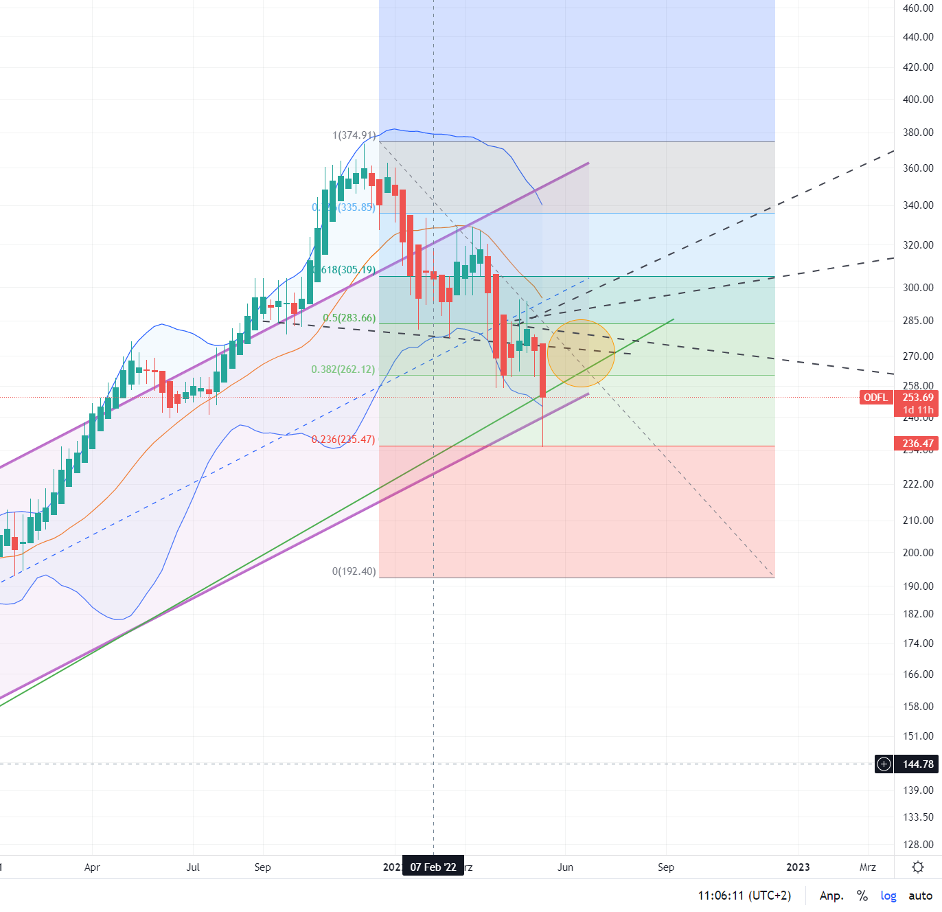 der interessante Korridor beginnt 12 - 15% unterhalb des heutigen Kurses. In diesem waagerechtem Kanal könnte die Aktie wieder kaufbar werden.