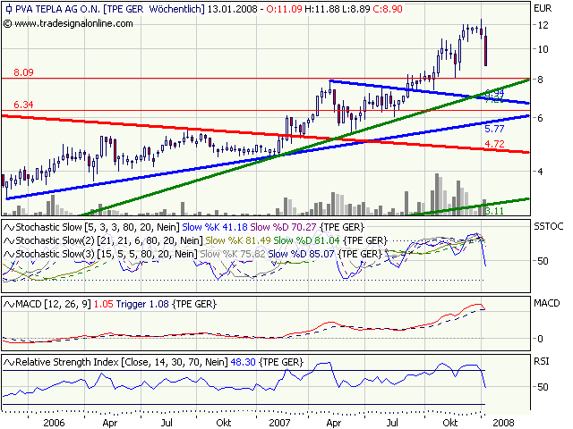 Auch wenn die Märkte derzeit alle Nebenwerte in Sippenhaft nehmen und einige Fonds, Kleinanleger derzeit Geld aus Aktien ziehen.... der Trend nach alternativen Ölquellen ist nicht zu stoppen und die jetzt schon festzustellenden Preiskämpfe machen diese Energiequellen (Sonne, Erdwärme, Wind und Gezeitenkraftwerke etc.) nur noch schneller Markt- und Wettbewerbsfähig .... das alles wirkt mittelfristig äusserst positiv auf die Aussichten der PVA TEPLA, und mit dem Auftragsestand,-eingang im Rücken ist mir nicht bang, sondern bestätigt nur dass PVA TEPLA die richtigen Technologien hat um aus diesen Megatrends auch noch mittel- langfristig profitieren zu können. Mittlerweile sehe ich dieses Unternehmen auch als lukratives Übernahmeziel...bin mal gespannt, wann Großfirmen wie Siemens, General Electrics in diesen Bereichen massive Zukunftsinvestments vornehmen werden. Alles nur eine Frage der Zeit....
