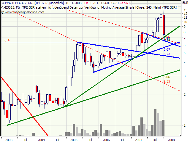 Diejenigen, die investiert sind, brauchen sich durch den Kursrutsch nicht verunsichern zu lassen. Dasselbe Schicksal haben die Aktionäre von Roth+Rau, vielen anderen Solartiteln den allermeisten TEchnologieaktien, fast alle Aktien hatten solche Rückschläge. Die allermeitsten ohne jegliche fundamentale Ursachen. Aber genau das ist die Natur solcher Korrekturen, die schon so lange andauern; irgendwann gehen die Begründungen aus; oder gibt es hier jemanden der begründen kann, warum eine Intel an dem Tag der Q-Zahlen um über 3% nachgeben, wenn doch 50%-ige Gewinnsteigerung verkündet wurde.