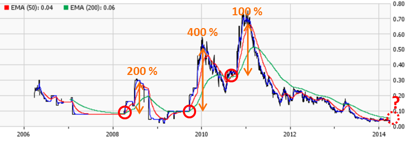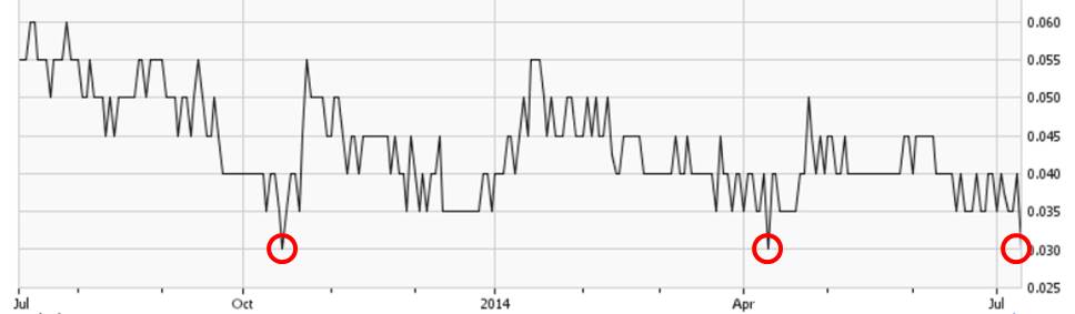 Zweimal in der jüngeren Vergangenheit hat sich das Niveau von C$ 0.03 als extrem harter Boden herausgestellt. Im Okt. 2013 sprang der Kurs an einem Tag um 33% auf C$ 0.04 zurück, das gleiche passierte im Apr.2014. Heute wieder? Ich für meinen Teil riskiere es nicht.