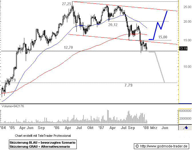 Charttechnischer Ausblick: Die Bewegung seit November 2007 kann immer noch als bärische Übertreibung eingeordnet werden. Ein Anstieg über 15,00 Euro auf Wochenschlusskursbasis wäre demnach ein starkes Rallyesignal. Ziel wäre dann zunächst 20,15 Euro. Später wäre eine Rallye bis ca. 24,00 Euro möglich. Sollte die Aktie aber unter 12,70 Euro abfallen, dann wäre eine Fortsetzung der Abwärtsbewegung mit Ziel bei 7,79 Euro zu erwarten.
