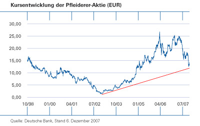 Die Aktie der Pfleiderer AG habe seit Anfang November deutlich an Wert verloren und sei gestern bei einem Kurs von 12,29 Euro aus dem Handel gegangen. Damit sei das Papier auch ein Opfer der US-Subprime-Krise geworden. So werde befürchtet, dass sich das US-Geschäft des Holzspezialisten Pfleiderer vor dem Hintergrund der Folgen der US-Subprime-Krise noch deutlich schlechter entwickeln könnte als bislang erwartet. Das Management von Pfleiderer reagiere auf die schwache Entwicklung im US-Geschäft mit einer Restrukturierung. Hierdurch sollten ab 2008 Kosteneinsparungen von bis zu 30 Millionen Euro realisiert werden.