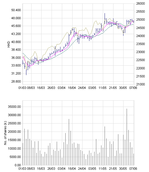 which caused shares to rise (+4% Friday). Now, the stock is likely to take a breather after recent gains," says Francis Lun at Fulbright; stock +12% since end-April. Short-term support likely at 10-day moving average around HK$45.72.(SUT) Contact us in Hong Kong. 852 2802 7002; MarketTalk@dowjones.com (Delayed by 1 hour)