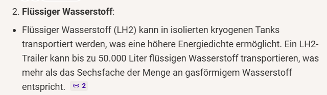 Komprimierst Du H2 mit 700 bar, dann hast Du ungefähr eine Energiedichte, die ein Siebtel von Benzin entspricht. PP spricht von Anhängern. Der Transport von H2 per LKW-Anhänger erfolgt nicht immer kyrokompriemiert, sondern einfach in Flaschen. Hat PP anstelle von Tauch-Pressluftflaschen jetzt diese 8 - 10 Meter langen Zylinder auf den Trucks, wird der H2 mit 200 oder 300 bar transportiert. D. h. ein 40 Tonnen LKW hat nur knapp mehr als eine halbe bis eine Tonne H2 dabei.