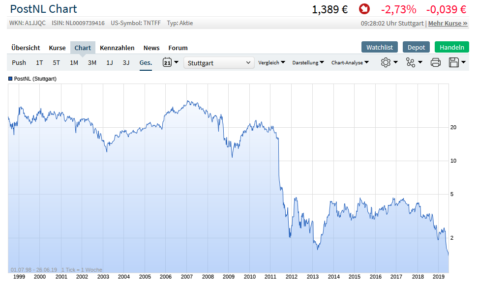 während meines Urlaubs bei den Postlern ....PostNL ..Royal P scheinen jetzt wirklich die Richtung geändert zu haben ( gut nach der Abschlachtung auch langsam fällig !! ) .. BPost ist noch ne Abstufung gekommen was kurz belastet hat bis 8 € ...aber auch hier wird sofort Schwäche gekauft ......meine Nachkäufe lagen auf den Punkt ...nicht nur Royal P auch jetzt PostNL in grüner Farbei bei mir im Depot ......meine KZ in diesem Jahr (wenn alles optimal weiter verläuft )sind bei Royal Post die 3,XX .....PostNL 2,XX ....BPost 10,XX ...