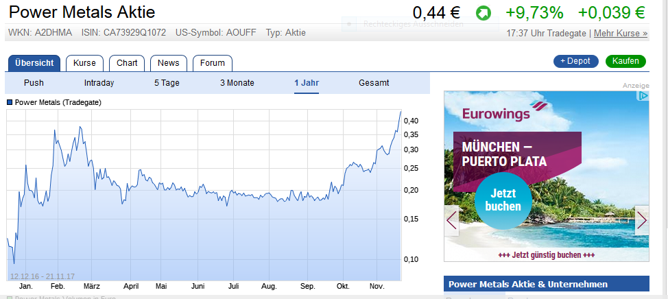Unser Lithium Hot Stock Power Metals Corp. erscheint im Branchenvergleich mit einem aktuellen Börsenwert von nur 24,44 Mio.. EUR massiv unterbewertet. Die kürzlich gemeldeten massiven Lithium-Konzentrationen auf dem potentiell weltbesten Lithium-Projekt Case Lake mit Lithium-Konzentrationen von bis zu 3,28% dürfte eine fulminante Kursrallye auslösen. Die Lithium-Aktien von Galaxy Resources sind in weniger als zwei Jahren um 2.692% von 0,12 AUD auf 3,35 AUD in die Höhe geschnellt. Aus einem Aktienkauf von 10.000 EUR wurde ein kleines Vermögen von 279.167 EUR. Aktuell werden die Aktien des Lithium Highflyers Galaxy Resources mit 987 Mio. EUR an der Börse bewertet - rund 40 mal mehr als der aktuelle Börsenwert unseres Lithium Hot Stock Power Metals Corp.