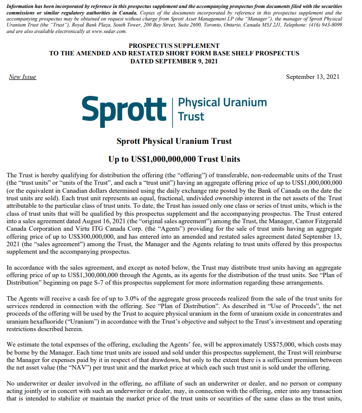 Sprott hat ein "at the money"-Anteilsangebot eingereicht, bei dem neue Anteile des Fonds jederzeit mit einem Aufschlag auf den Nettoinventarwert des Fonds gehandelt werden können.