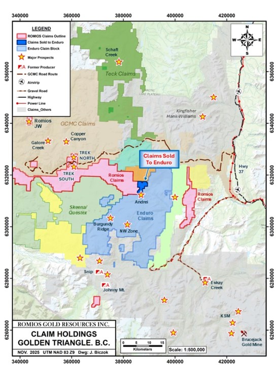 Daten zu Romios Gold Toronto, Ontario--(­Newsfile Corp. - November 10, 2025) - Romios Gold Resources Inc. (TSXV: RG) (OTCID: RMIOF) (FSE: D4R) ("Romios Gold" or the "Company")­ is pleased to announce that is has sold a 100% interest in a 1,200 hectare claim package to Enduro Metals Corp. ("Enduro")­ for $300,000 cash. Romios Gold retains a 2% net smelter returns royalty in the claims (the "2% NSR"). The three (3) claims (the "Royalty Property")­ are located adjacent to Enduro's 'Andrei' target on its Newmont Lake project (see Figure 1) and encompass a large magnetic high, part of a newly recognized­ trend of both magnetic and geochemica­l anomalies suggestive­ of porphyry copper-gol­d potential.­