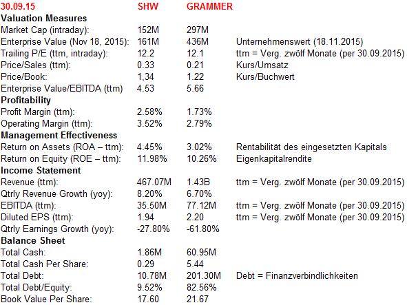 -- EV/EBITDA (ttm): SHW (4,53) für einer Unternehmenskäufer günstiger zu haben als Grammer (5,66)