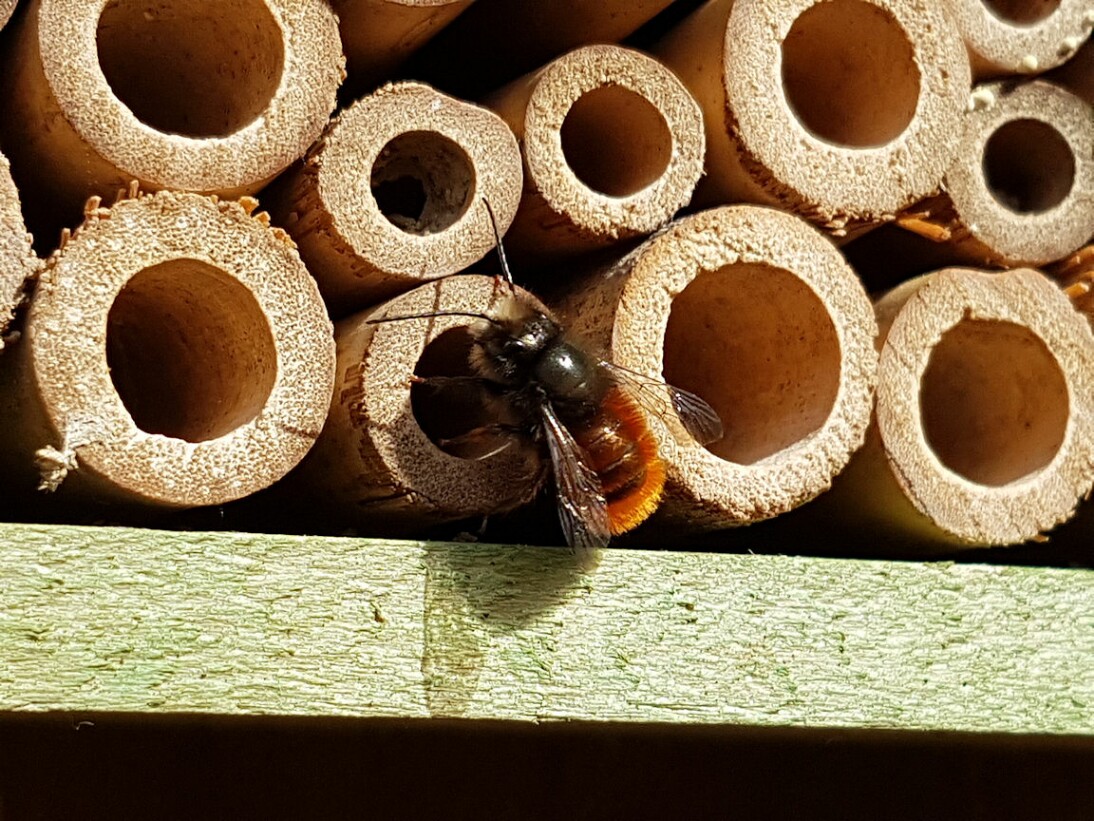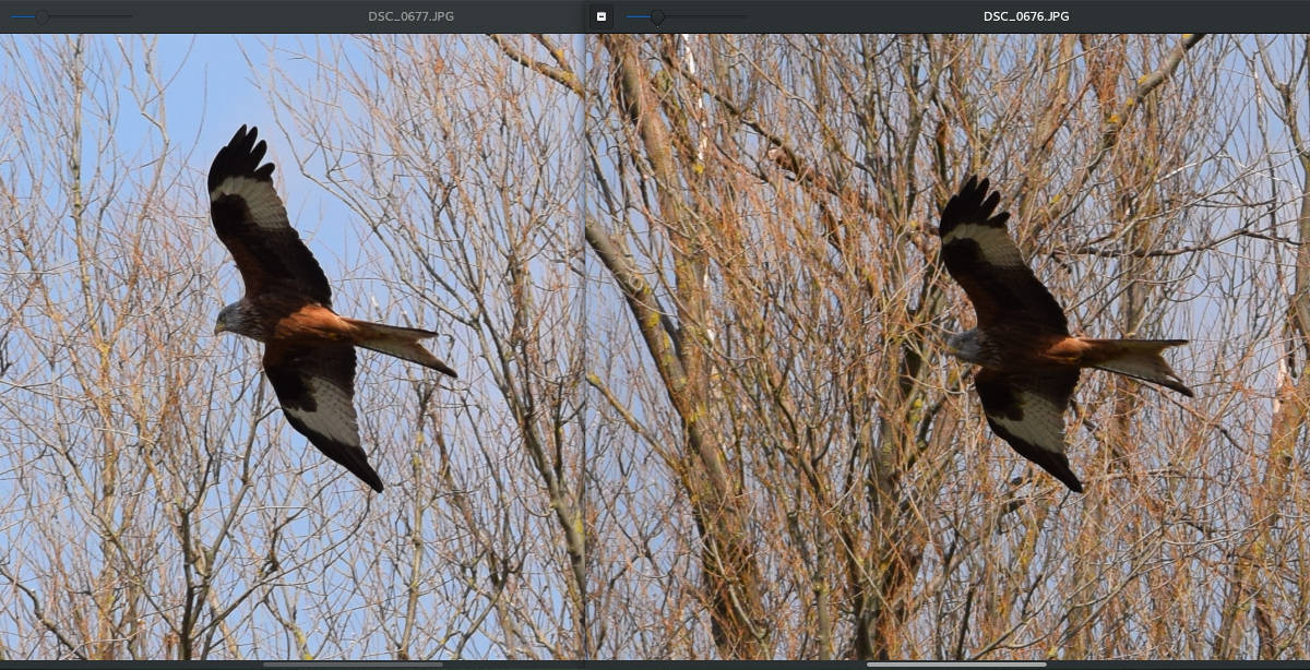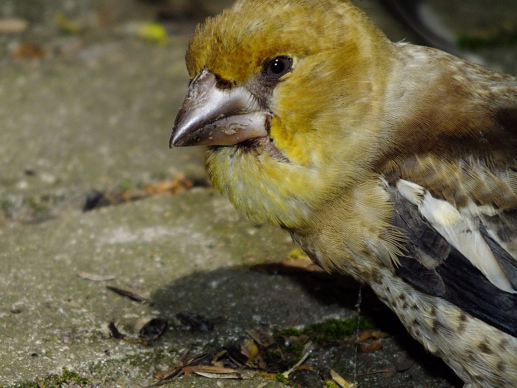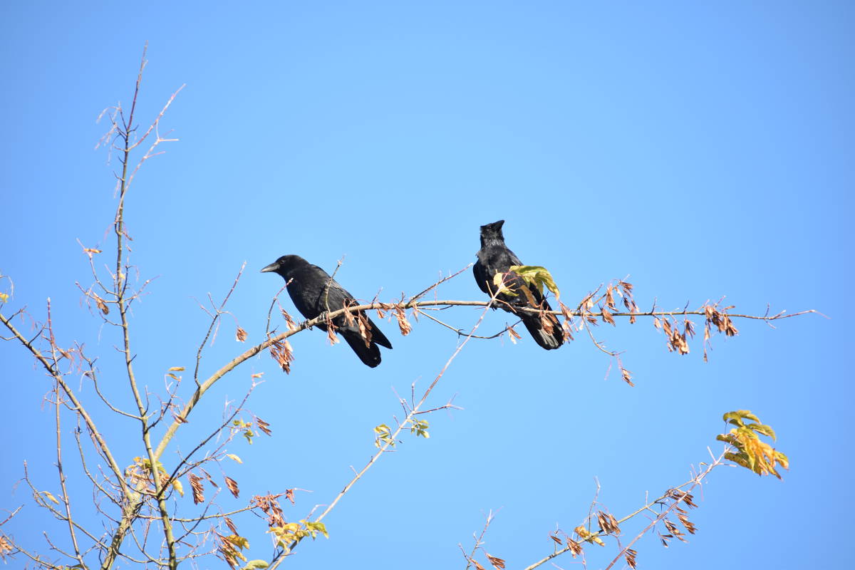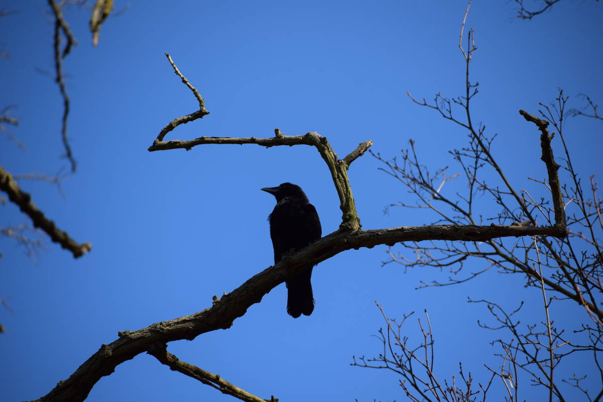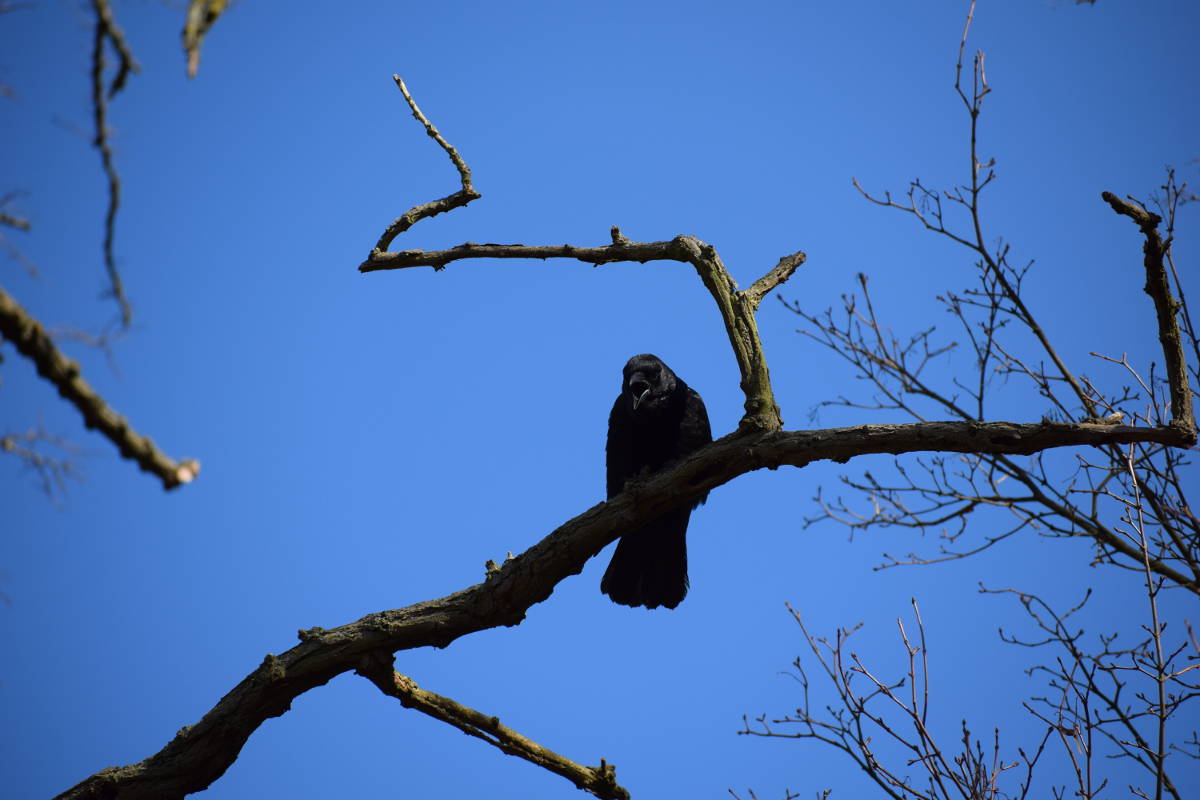aber appart, wie er sich unter den Zweig hockt...