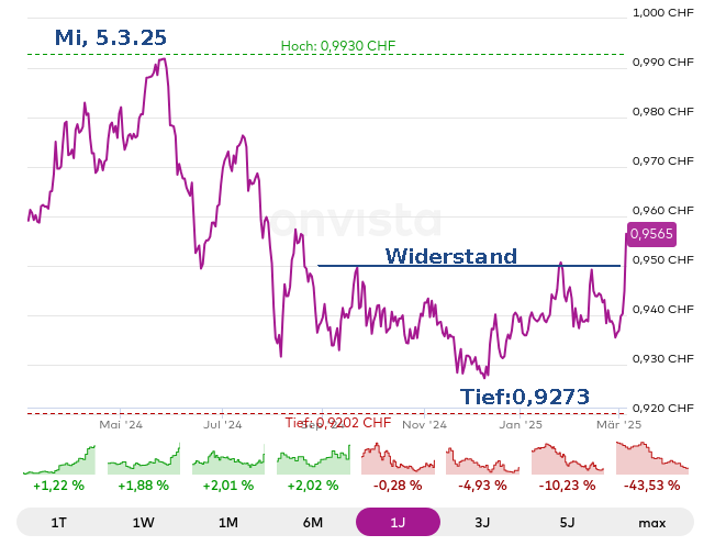 Weiter gilt ein Kauf-Signal für den Euro. Erst das Unterschreiten der 0,9350 Marke auf Schlusskurs-Basis generiert ein Verkaufs-Signal.