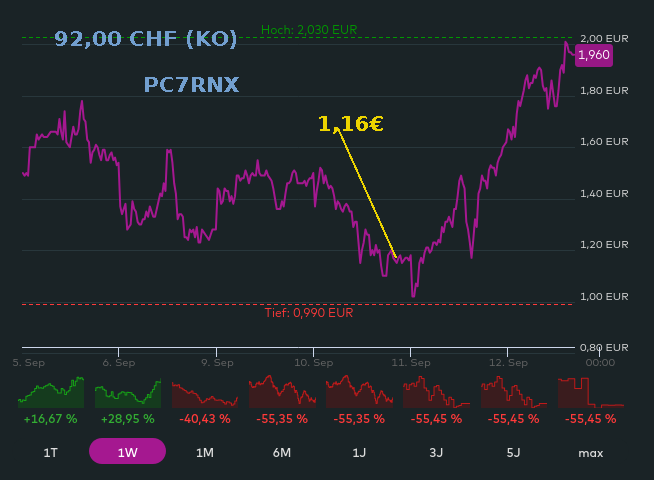 PC7RNX KO: 92,00 CHF, Laufzeit: 20.12.24, aktueller Briefkurs: 1,16€