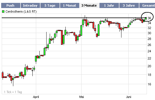 Rückblick: Die Centrotherm Aktie startete im Februar zu einer deutlichen Kursrallye und erreichte im Mai die 35,80 Euro Marke. Dort startete eine Zwischenkorrektur, welche zwischen der exp. GDL 200 (EMA200) und der 35,80 Euro Marke verläuft.